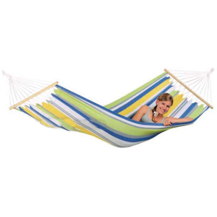 Amaca comoda e sicura, ideale per sognare o rilassarsi.Realizzata nello speciale materiale innovativo EllTex: Extra Long Lasting Textile (cotone e poliestere) Dimensioni: 200 x 100 cm Lunghezza totale: 310 cm Aste di frassino da cm 80 Portata kg 120 ca.