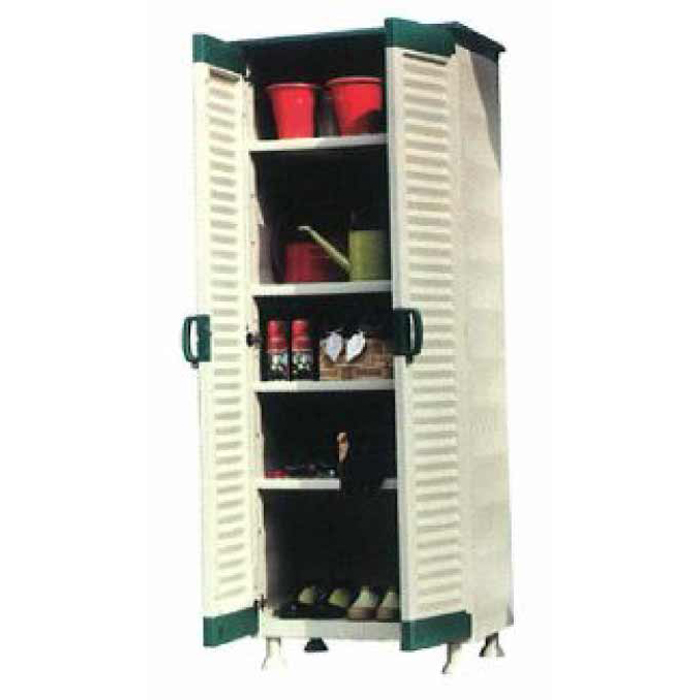 4 ripiani regolabili a diverse altezze. Ante a tapparella. 6 cerniere in metallo. 45 cm di profondit? totalmente utilizzabili. possibilit? di lucchetto. Piedini regolabili. Protezione raggi UVA. tetto spiovente per evitare infiltrazioni d'acqua. montaggio semplice e veloce. Dimensioni 70 x 189 x 48 cm.