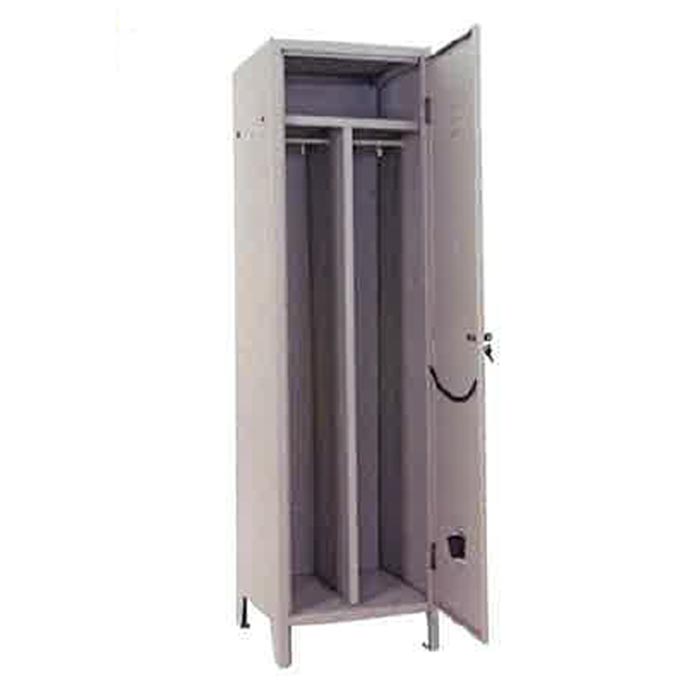 Armadio sporco/pulito a 1 posto, 1 anta. Realizzato in lamiera d'acciaio con struttura interamente saldata e verniciato con polveri epossidiche. Corredo di serie: portaombrelli, portasciugamani, appendiabiti, ripiano interno, serratura, feritoie, portacartellino. Serratura o maniglia lucchettabile. Colore di serie grigio RAL 7035. Dimensioni H 1795 x L 500 x P 500.