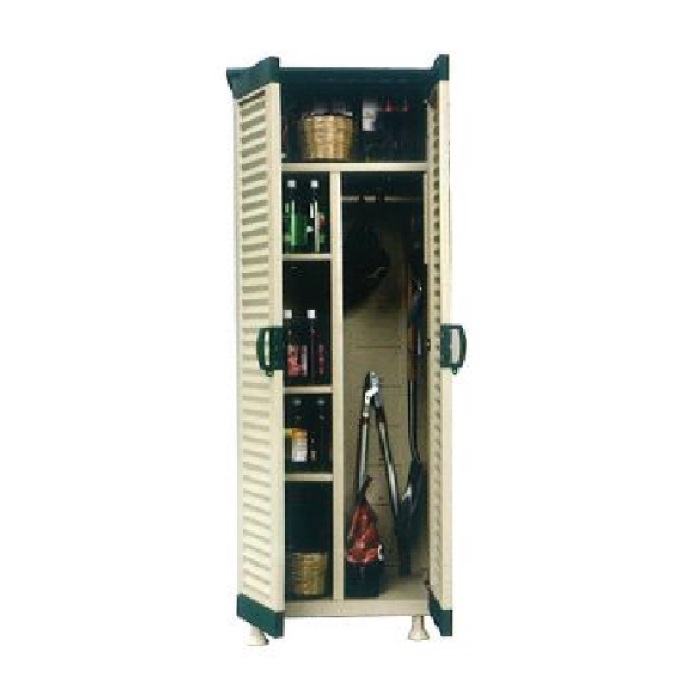4 piani regolabili a diverse altezze e divisorio verticale, ante a tapparella, 6 cerniere in metallo. Barra appendiabiti, 45 cm di profondit? totalmente utilizzabili, possibilit? di lucchetto, piedini regolabili. Protezione raggi UVA, tetto spiovente per evitare infiltrazioni d'acqua, momtaggio semplice e veloce. misure: 70 x 189 x 38 cm.