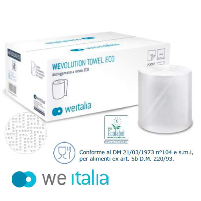 Asciugamano a rotolo a 2 veli -150 mt Materia prima: Fibre rigenerate - Certificazione: Ecolabel Conforme al DM 21/03/1973 n°104 e s.m.i, per alimenti ex art. 5b D.M. 220/93.