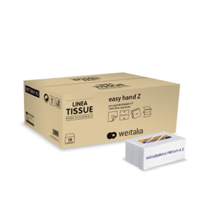 Produzione LUCART con Marchio WE-ITALIA Asciugamani carta 2 veli interfogliati a Z 230x235 mm. Prezzo per imballo da 18 confezioni. da 220 pz (3.960 pz) Peso totale imballo 10,5 kg.