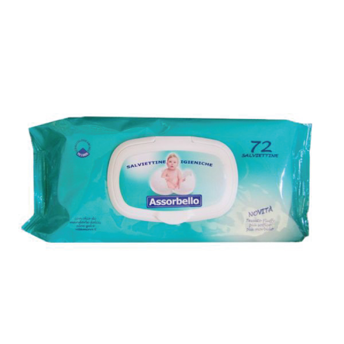 Salviettine igieniche con soluzione emolliente ed idratante arricchita con olio di mandorle dolci, Aloe gel e vitamina E. Particolarmente pratiche sostituiscono in modo efficace acqua e sapone. Prezzo x imballo da 12 confezioni pocket da 72 salviettine da mm 180 x 200.