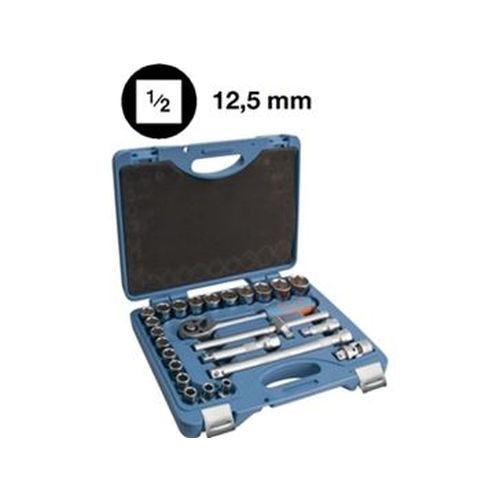 Attacco 1/2" - In acciaio al cromo-vanadio - Esecuzione cromata Composto da 25 utensili: 19 chiavi a bussola esagonali «Flank Profile» da 8 - 10 - 11 - 12 - 13 - 14 - 15 - 16 - 17 - 18 - 19 - 20 - 21 - 22 - 23 - 24 - 27 - 30 - 32 mm 1 leva a T con attacco scorrevole 1 leva a cricchetto, lunghezza 275 mm 1 prolunga lunghezza 75 mm 1 prolunga lunghezza 125 mm 1 prolunga lunghezza 250 mm 1 snodo cardanico In valigetta di resina sintetica resistente agli urti, dimensioni LxPxh 360x280x75 mm