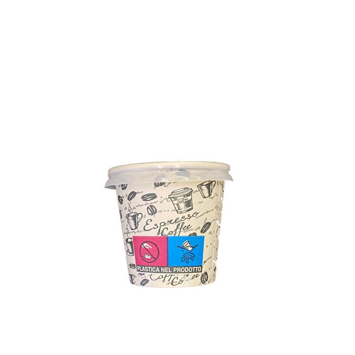 Bicchiere in cartoncino per asporto di bevande calde tipo caffè con laminatura interna.