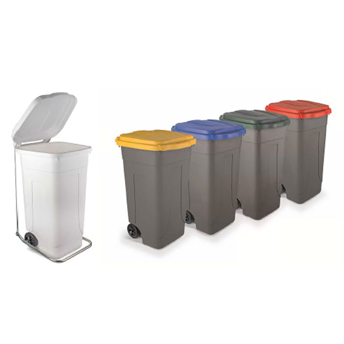 Pratico bidone porta rifiuti con ruote, realizzato in PP (Polipropilene) 100% riciclabile, disponibile in versione bicolore con fondo grigio e coperchio colorato (blu, giallo, rosso e verde). Il bidone è particolarmente adatto per ambienti interni. Disponibile come accessorio il kit di pedale e fermasacco.