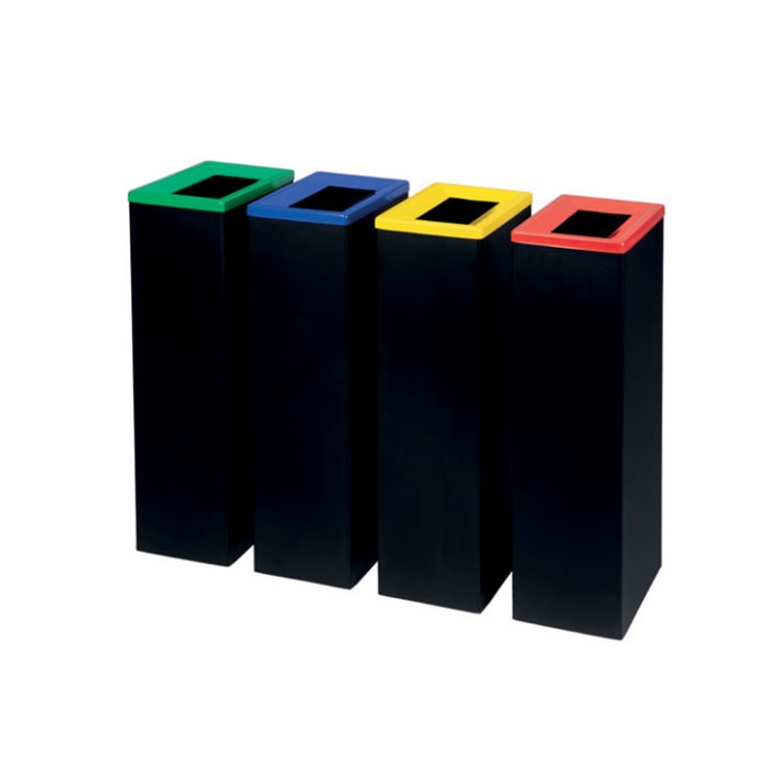 Contenitore per rofiuti e gettacarte in metallo verniciato. Profili colorati per incentivare la raccolta differenziata. Sistema reggisacco integrato. Installazione murale o d'appoggio. Ideal per creare isole ecologiche, viteria non fornita. Dimensioni: H70xL30xP20 - PREZZO PER 1 CONTENITORE CON 1 CORNICE COLORATA