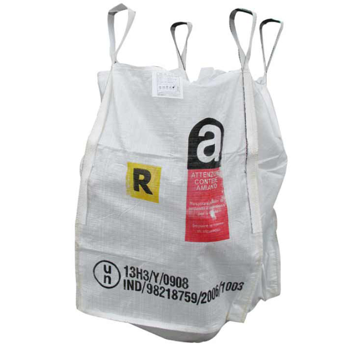 Si tratta di big bags omologati UN per lo stoccaggio e per il trasporto stradale, navale e su rotaia di merci pericolose. Sacconi costruzione tubolare dimensioni 90x90x120 cm omologati ONU - UNI13H3Y - Apertura a caramella fondo chiuso, tela normale , Liner inserito, portata kg 1.000 rs 6/1 - Etichetta R + A - Peso 2,2 kg. Prezzo comprensivo del CONAI fascia A.