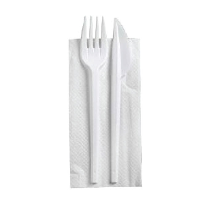 BIS POSATE FORCHETTA E COLTELLO da 4,5 grammi PLA + TOV.LO 1V. Il PLA è particolarmente indicato per cibi e bevande che non superino i 50 gradi di temperatura. Prezzo per imballo da 500 bis + tovagliolo imbustati singolarmente.