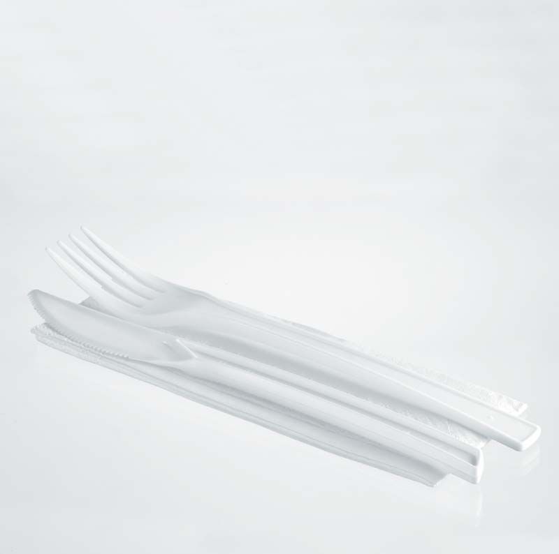 Linea BioWAre BIBO-HUHTAMAKI. Tris di posate biodegradabili in MATER-B confezionate in 500 pz imbustate insieme forchetta + coltello + cucchiao + tovagliolo