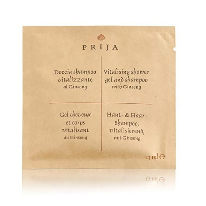 Bustina Doccia Shampoo PRIJA vitalizzante al Ginseng , per linea cortesia hotel, bustina da 13 ml , imballo da 500pz