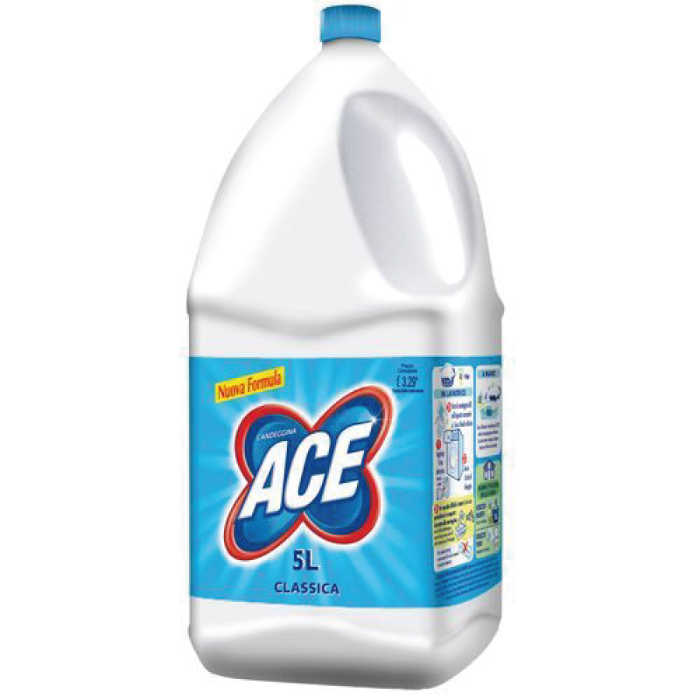 Candeggina ACE, PH 13.0 , non infiammabile, non esplosiva, non ossidante. Il prodotto per uso domestico può essere versato nello scarico dopo l'uso. PREZZO PER 1 TANICA - Imballo da 2