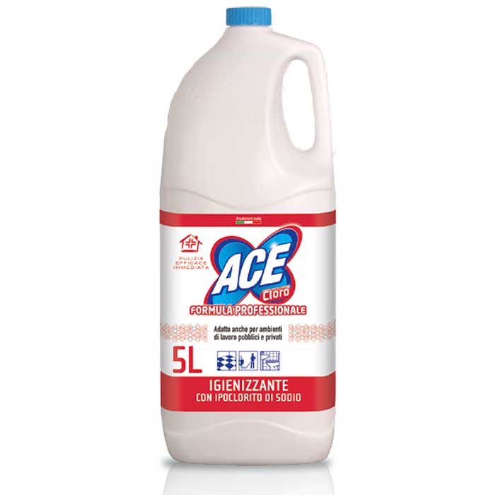 ACE CLORO CANDEGGINA formula professionale è basato su una formula ad elevato tenore di cloro attivo e sugli stabilizzanti brevettati ACE. Grazie al PH13 della formula è il prodotto con la massima efficacia all'interno della linea ACE CLORO, per una versatilità che garantisce risultati di pulizia, igiene, rimozione dei cattivi odori, rimozione di muffa e di grassi. ACE CLORO CANDEGGINA può essere usato puro su piccole superfici quali sanitari, WC, piani di lavoro o diluito con acqua per pavimenti interni ed esterni o anche per il bucato grosso in lavatrice aggiunto al detersivo. Confezione da 2 taniche. Pallet da 76 confezioni.
