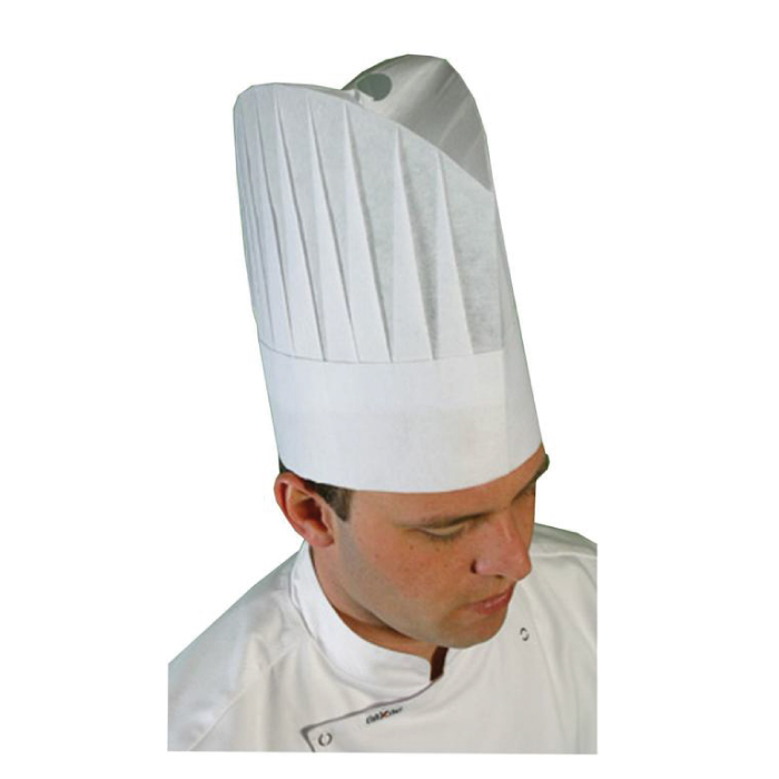 Cappello da cuoco alto 300 mm, realizzato in robusta carta goffrata e tela di lino. è interamente piegato, ha una bandaassorbente e regolabile, fresco e leggero. Prezzo (1 cf da 10 pz)