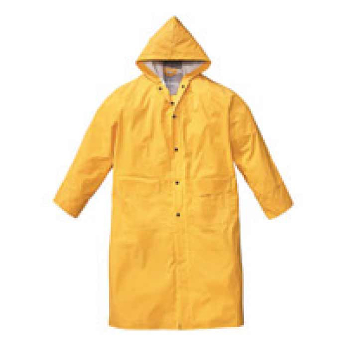 Cappotto impermeabile in PVC/poliestere/PVC Cappuccio fisso con cordino Chiusura con bottoni automatici 2 tasche con patta antipioggia Fori di aereazione sul dorso e sotto le ascelle Soffietto controvento alla manica.
