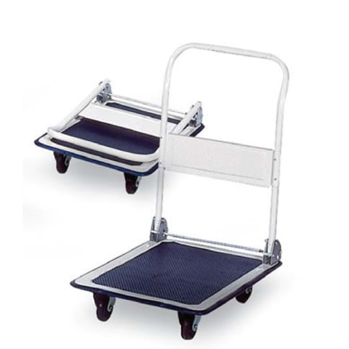 Carrelli in acciaio con sponda ribaltabile, piano di carico da 740 x 480 mm. bordi rivestiti in gomma, 4 ruote in gomma da 100 mm. di cui 2 fisse e 2 girevoli. Forniti smontati in scatola di cartone. Portata 150 kg.