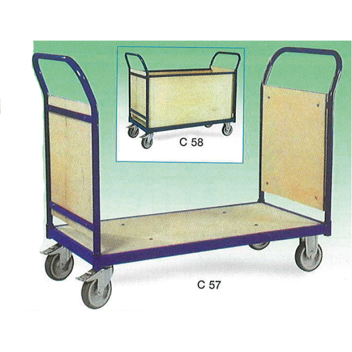 Carrello con 2 sponde in legno alle testate e 2 sponde in legno laterali, altezza da terra 650 mm. Piano in legno 1000x500 mm. - 4 ruote gommate diametro 100 mm. 2 fisse e 2 girevoli con freno. Portata 250 kg.
