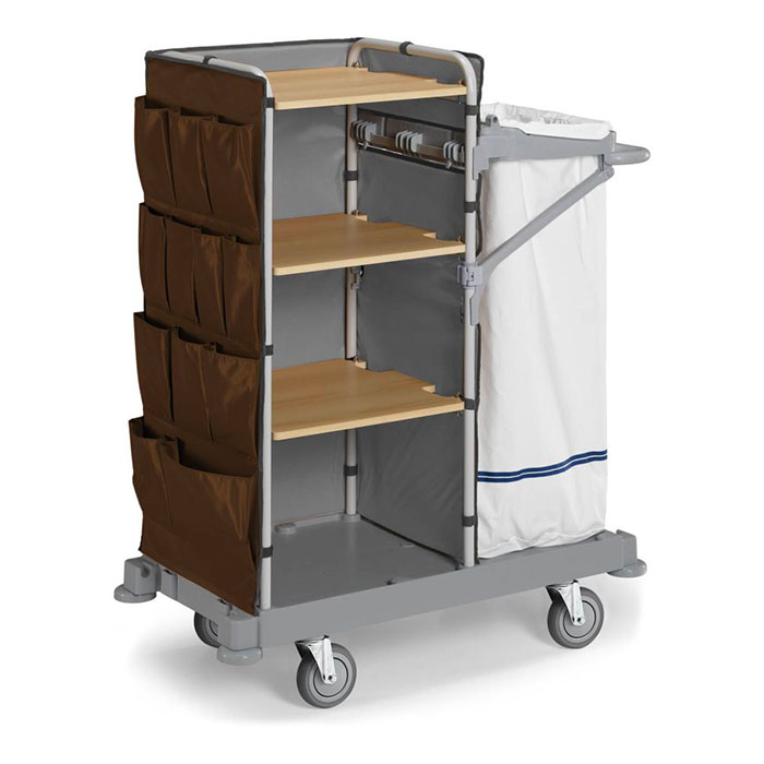 Carrello con ripiani in legno. Carrello di servizio per il trasporto della biancheria pulita e la raccolta della biancheria sporca negli hotel, nelle collettività e nelle comunità. Prodotto realizzato con materiali separabili e quindi riciclabile a fine vita. Componenti in materiale anti ruggine. Robusta base in plastica utilizzabile come quarto ripiano. Schienale con facile fissaggio con sistema a strappo; superficie liscia, facilmente pulibile e leggera, dotato di comode e pratiche tasche utilizzabili per il trasporto di oggetti vari. Portasacco da 120 lt con maniglia ergonomica di spinta; completo di tendisacco e rinforzi per una massima resistenza nel tempo.