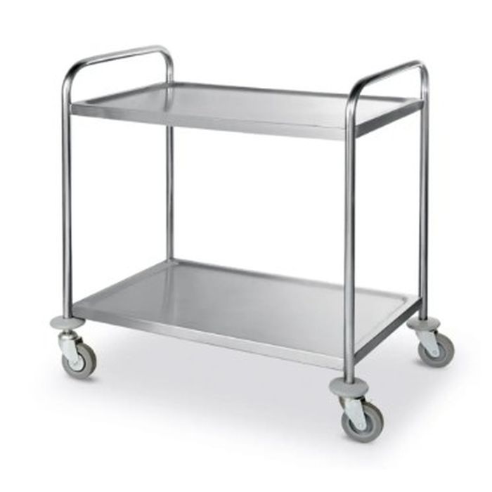 Carrello di servizio a 3 piani in acciaio inox Aisi 201.. Struttura in tubo tondo lucido diametro 2,5 cm. Piani a forma di vassoio con superfici arrotondate, insonorizzati, imbullonti al telaio. Finitura spazzolata. Paracolpi in...