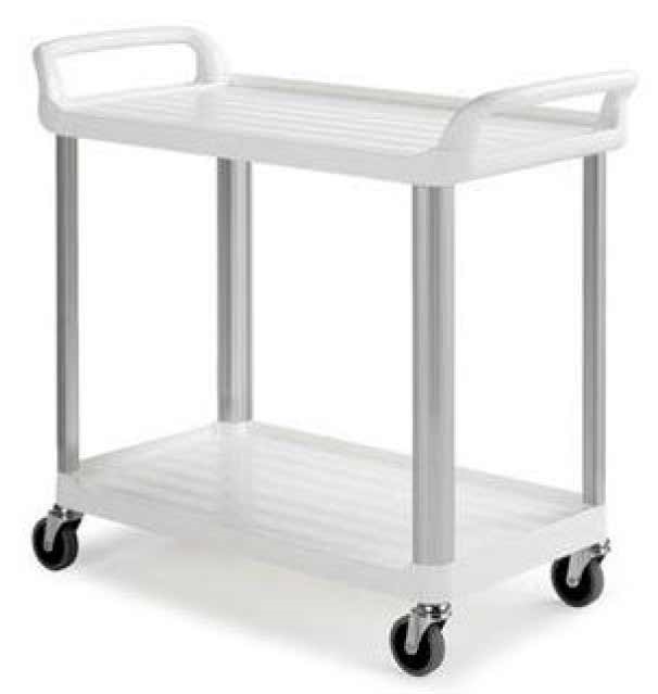 Carrello di servizio a 2 ripiani , con montanti in plastica, 2 impugnature con ruote da 100 x 28 mm. portata 50 kg. per piano. Ideale per il trasporto di oggetti vari nel settore della ristorazione e della sanità. - Dimensioni L=50 cm P=111 cm H=102 cm. Disponibile anche nella versione a 3 ripiani.