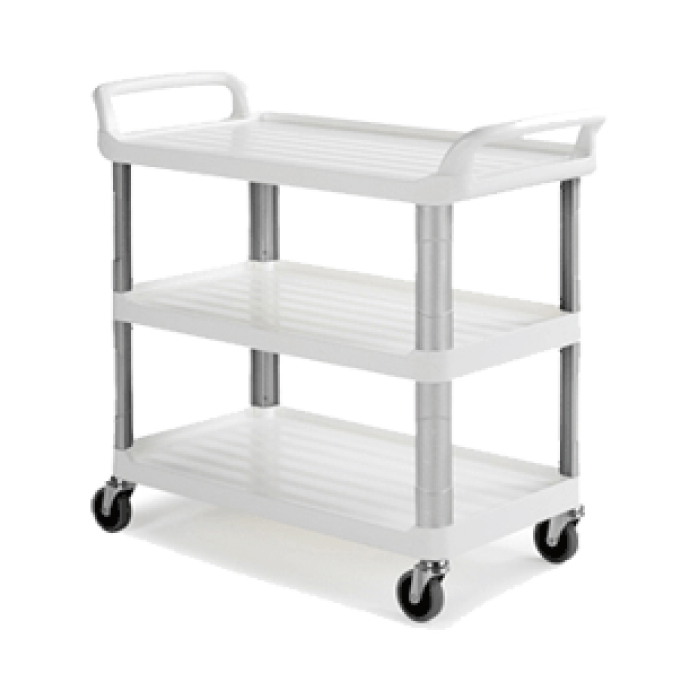 carrello di servizio a 3 ripiani , con montanti in plastica, 2 impugnature con ruote da 100 x 28 mm. portata 50 kg. per piano. ideale per il trasporto di oggetti vari nel settore della ristorazione e della sanità dimensioni l=50 cm p=111 cm h=102 cm. disponibile anche versione a 2 ripiani.
