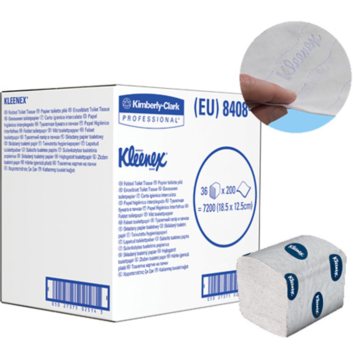 Carta igienica 2 veli KLEENEX® interfogliata., confortevole, morbida, assorbente, con LOGO KLEENEX impresso su ogni foglio. Imballo da 36 confezioni da 200 fogli cm 18,6 x 12,5 (7.200 fogli). Peso totale imballo kg 6. Per dispenser AQUARIUS 6946 - Prezzo per 1 ct da 36 cf