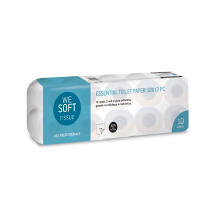 Carta igienica pura cellulosa 2 veli. 120 rotoli da 155 strappi pari a 18 metri/ca. Prezzo per imballo da 12 confezioni da 10 rotoli. (120 rotoli). Peso totale imballo kg 7. Pedana da 20 colli.