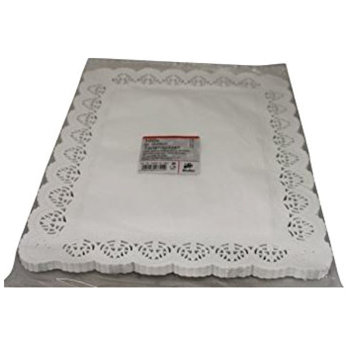 Sottopiatto decorativo rettangolare in carta smerlata ad uso alimentare fustellata a pizzo. Modello da 30 x 40 cm. Confezione da 250 pezzi. Cartone da 4 cf.