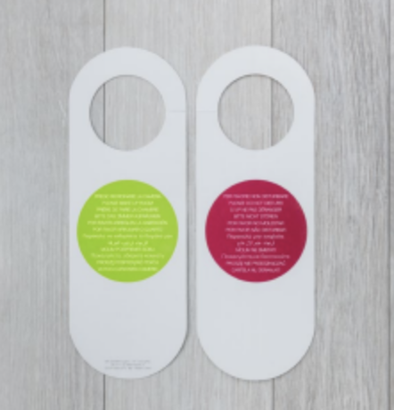 Cartellino economico MANIGLIA GENERICO con lato rosso o verde. Scritta "non disturbare" su un lato e "rifare la camera" sull'altro. Italiano e Inglese. Realizzato in cartoncino. Imballo in confezione da 500 pz.
