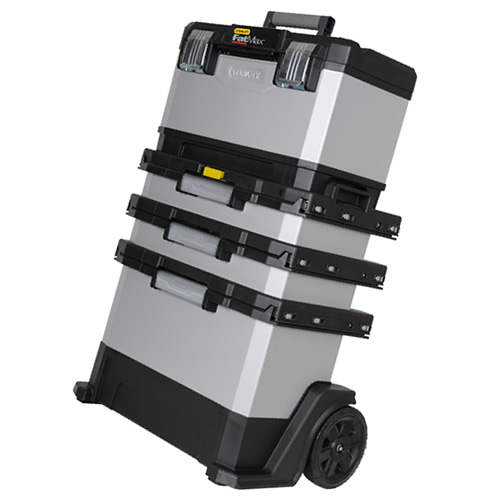 Carrello portautensili in metallo e polipropilene. Composto da cassetta, due cassetti ed ampia base. Cassetta superiore con coperchio scanalato e vaschetta estraibile. La cassetta ? separabile con la semplice pressione di un bottone. Cassetti con guide in acciaio con cuscinetti a sfera, per scorrimento morbido e grande capacit? di carico. Base fissa con grandi ruote. Maniglione telescopico. Base e cassetto si aprono con facilit? formando una postazione di lavoro. Asole per chiusura a lucchetto. Dimensioni: mm.568x893x389.