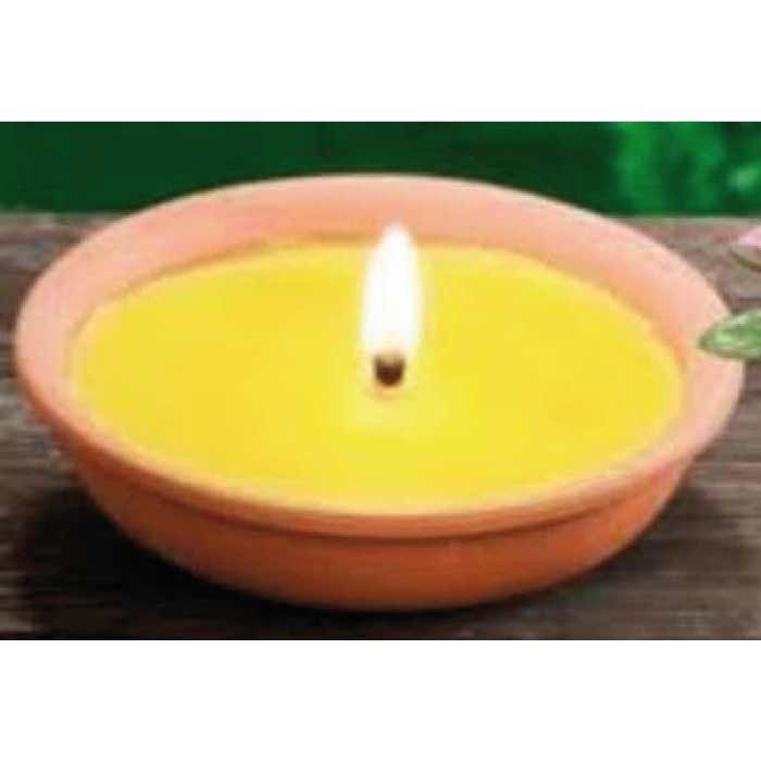Candela da giardino con cera alla Citronella diametro 18 cm. in contenitore di terra cotta (coccio). Prodotto produzione italiana: stoppino antivento più alto e più spesso. Imballo in cartone da 24 pezzi.