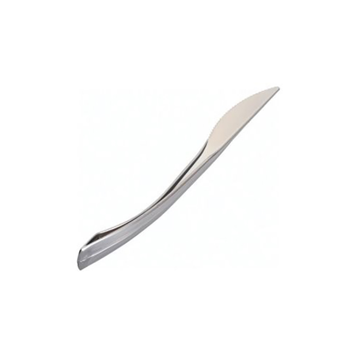 ATTENZIONE: ARTICOLO RIUTILIZZABILE Coltello in plastica color argento da 20 cm. imballo da 400 pz 10 cf da 40 pz Prezzo per imballo da 400 pz