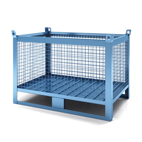 Contenitore metallico impilabile in rete con sponda asportabile colore blu RAL 5015. Dimensioni 1200x800x650+150+50h. Tara 53 kg/ca. Portata 800 kg.