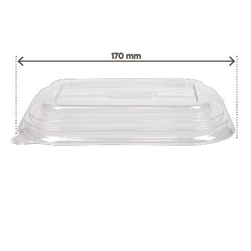 Coperchio monouso in rPET riciclabile per bowl rettangolari da 500ml. Specifiche tecniche: lunghezza 170 mm x larghezza 120 mm