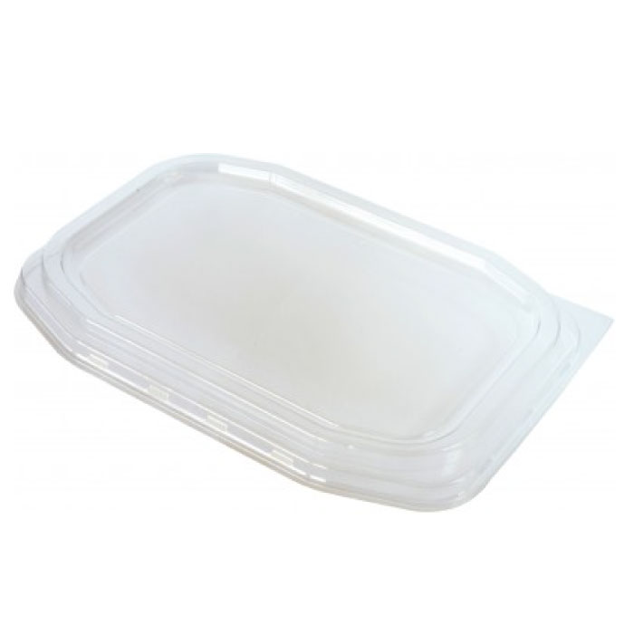 Contenitore rettangolare con COPERCHIO CONCAVO (bombato) a cerniera in PET. Apertura facile con alette bilaterali. Pareti resistenti all'impilaggio. Capacità 2000 cc - dimensioni 225 x 170 H.50. - Imballo da 200 pezzi