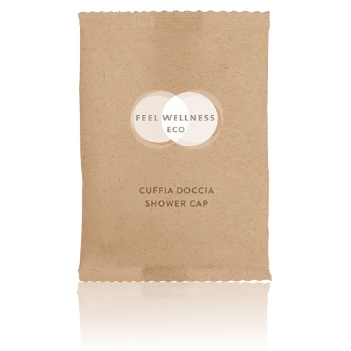 Cuffia doccia in sacchetto di carta ricicltata linea ECO WE-ITALIA FEEL WELLNESS dimenisoni: 7,5 x 10. Prezzo per confezione da 100pz. imballo da 10 cf.
