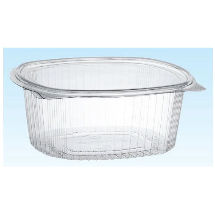 Contenitore semiovale con coperchio unito a cerniera in OPS. Apertura facile con alette bilaterali. Chiusura ermetica a tenuta dei liquidi. Pareti resistenti all'impilaggio. Dimensioni : 220 x 190 x H.70. Imballo da 200 pezzi.