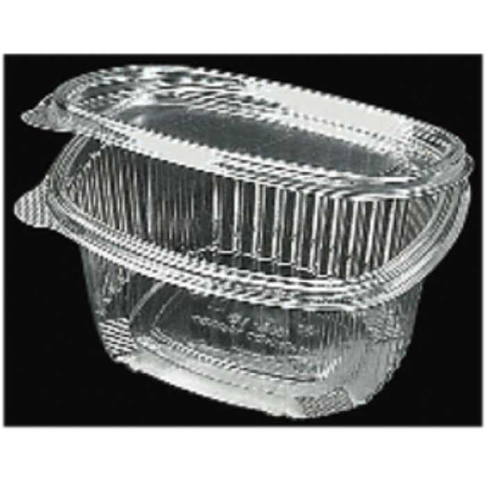 Contenitore semiovale con coperchio unito a cerniera in OPS. Apertura facile con alette bilaterali. Chiusura ermetica a tenuta dei liquidi. Pareti resistenti all'impilaggio. Dimensioni : 140 x 110 x H.43. Imballo da 600 pezzi (12x50).