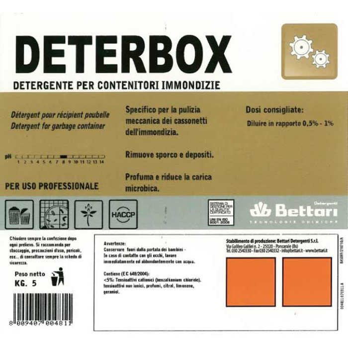 Detergente per la pulizia meccanica a spruzzo di contenitori di immondizia. Rimuove ogni tipo di grasso e depositi organici e riduce la carica microbica. Deterge e sanifica in una unica operazione sia in acqua calda che fredda. Prodotto a base di sali ammonio quaternari.
