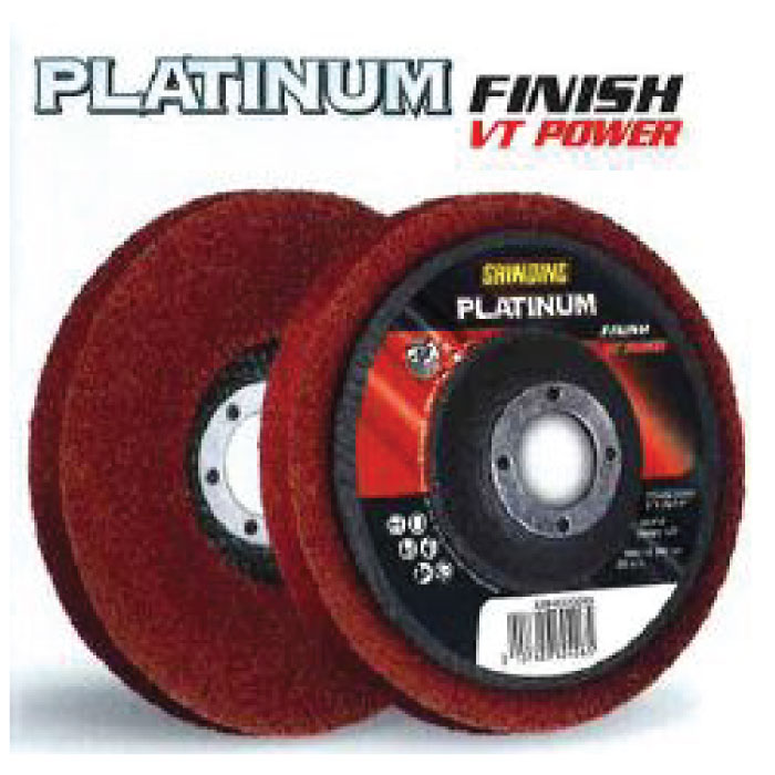 Rivoluzionario disco in Tessuto Non Tessuto compresso ad alta densit?, ideale nella rifinitura e lucidatura. Permette in una unica soluzione di armonizzare saldature Tig, omogenizzare la superficie eliminando i segni di sgrossartura dopo il passaggio del disco lamellare ed ottenere al contempo un elevato grado di finitura del materiale lavorato. Grana abrasiva vetrificata agglomerata di ultima generazione. Supporto in fibra di vetro. PLATINUM FINISH VT POWER