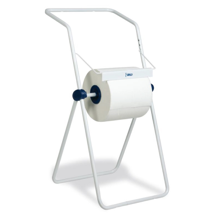 Portarotolo da pavimento con struttura in tubo metallico colore bianco.