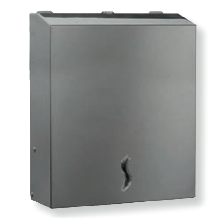 Dispenser in acciaio inox satinato AISI 304 per asciugamani di carta a C V Z idoneo per 400 asciugature. Finestra per il controllo della carta e serratura antivandalo. Dimensioni mm 280 x102 x 365.