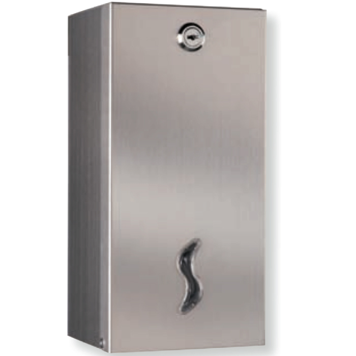 Distributoredi carta igienica interfogliata in acciqaio inox Aisi 304 con finitura satinata. Capienza 500 fogli con finestra per il controllo del livello della carta e serratura antivandalo in metallo. Dimensioni 270x120x133 mm.