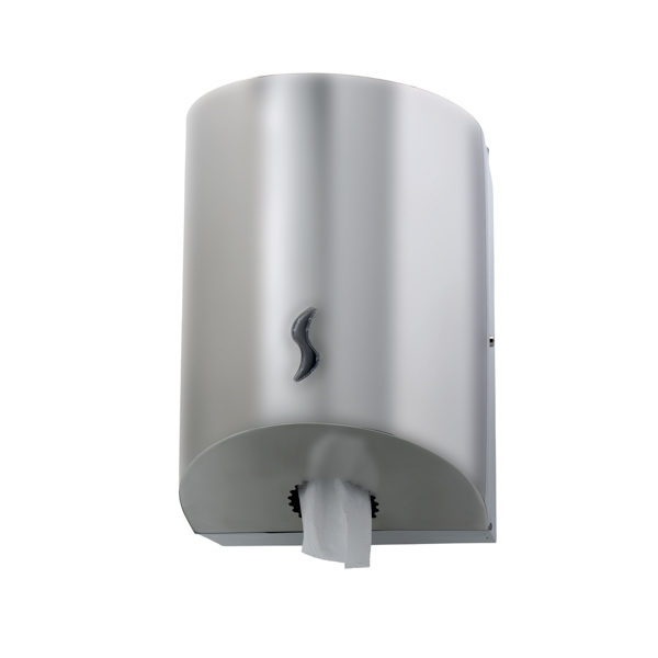 Dispenser di carta a srotolamento centrale in acciaio inox.