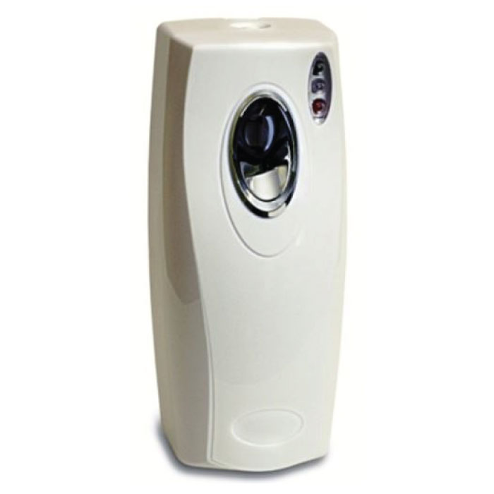 Erogatore automatico programmabile per bombole aerosol. Meccanismo "Night & Day" Indicatore acustico per la sostituzione delle batterie. Colore bianco. Alimentazione con 2 batterie mezza torcia (non incluse). Dimensioni 9,4 x 21 x 8,5 cm. Peso 350 gr. Marcatura CE.