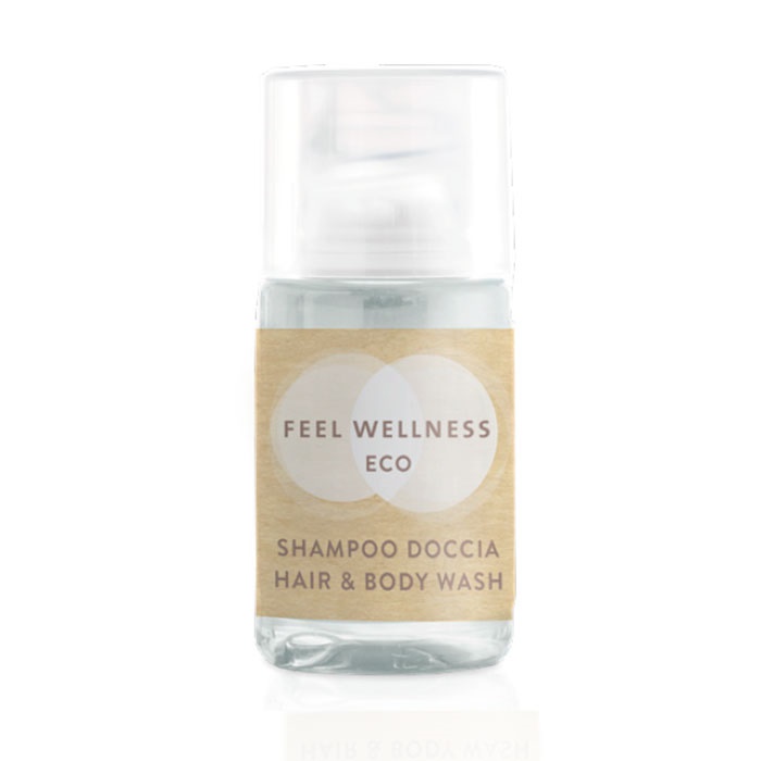 Flaconcino trasparente shower gel doccia shampoo da 20 ml con estratto di Aloe Vera, "linea cortesia"ECO We-Italia-GFL FEEL WELLNESS ECO. Prezzo per cartone da 400 pz.