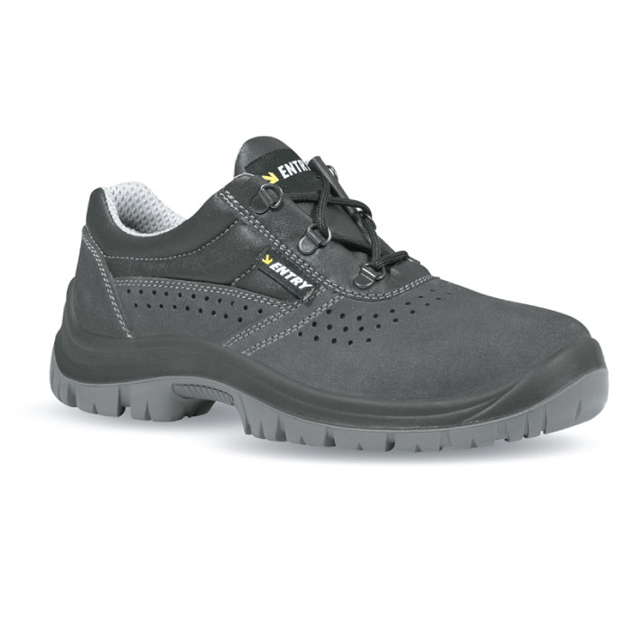 Tomaia in pelle scamosciata forata, fodera altamente traspirante in 3D, puntale in acciaio, lamina antiperforazione acciaio ergonomica , coprisottopiede Flat Fit, plantare amovibile anatomico, intersuola in soffice PU espanso, battistrada compatto antiabrasione, antiolio, antiscivolo e antistatico, calzata 11 Mondopoint pianta larga. Taglie dalla 35 alla 48.