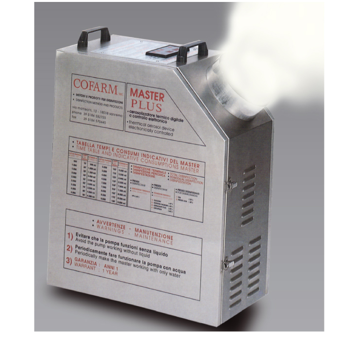MASTER PLUS COFARM: Generatore di aerosol a secco per trattamento disinfettante in ambienti chiusi. Produce un aerosol "caldo" (a circa 40 gradi) che comunque non scalda apprezzabilmente l'ambiente. Motore 220 volt monofase 50/60 hertz. Sonda termica per controllo temperatura di lavoro dell'aerosol, pompa volumetrica in grafite e viton, consumi medi 50ml/min, peso a vuoto 30 kg, timer elettronico da 2 a 240 minuti, struttura in acciaio inox satinato, pannelo di comandi digitale.