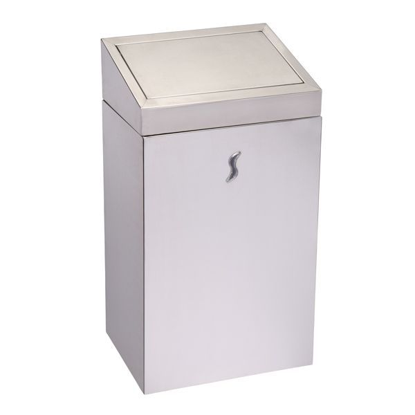 Acciaio inox AISI 201 satinato; apertura del coperchio "push"; reggisacco interno; fissaggio murale o d'appoggio; kit d'installazione incluso (viteria inox e tasselli).