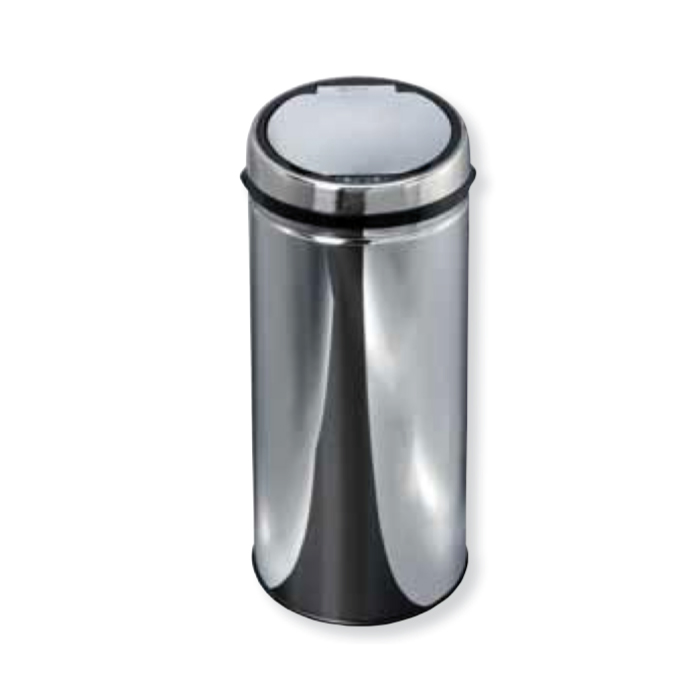 Gettacarte in acciaio inox ad apertura e chiusura automatica con sistema ad infrarossi Secchio interno in polipropilene con maniglia. Coperchio in ABS cromato Utilizza 4 batterie di tipo D stilo 1,5 V (LR6 non fornite) Adattatore per connessione alle rete elettrica (in opzione)